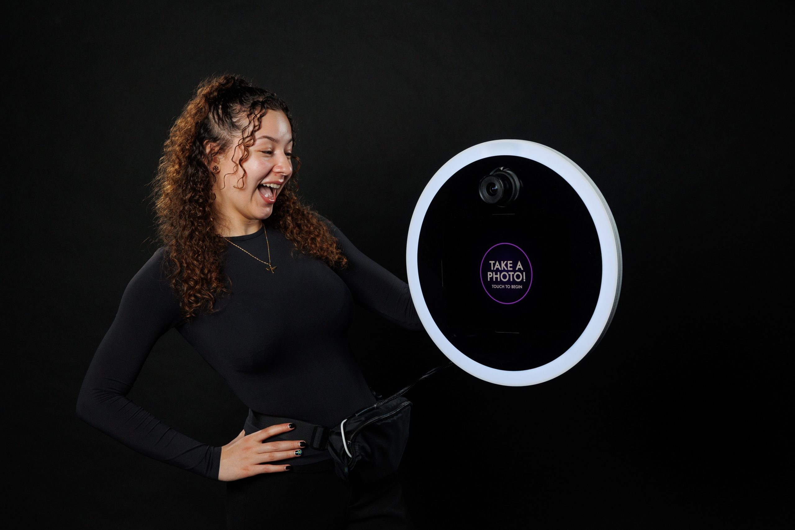 The Duo Pro is a Hybrid photo booth that features the popular Curve photo booth stand with a removable handheld roamer head. Brand new iPad 13″ shows the images while a Canon mirrorless camera creates them.