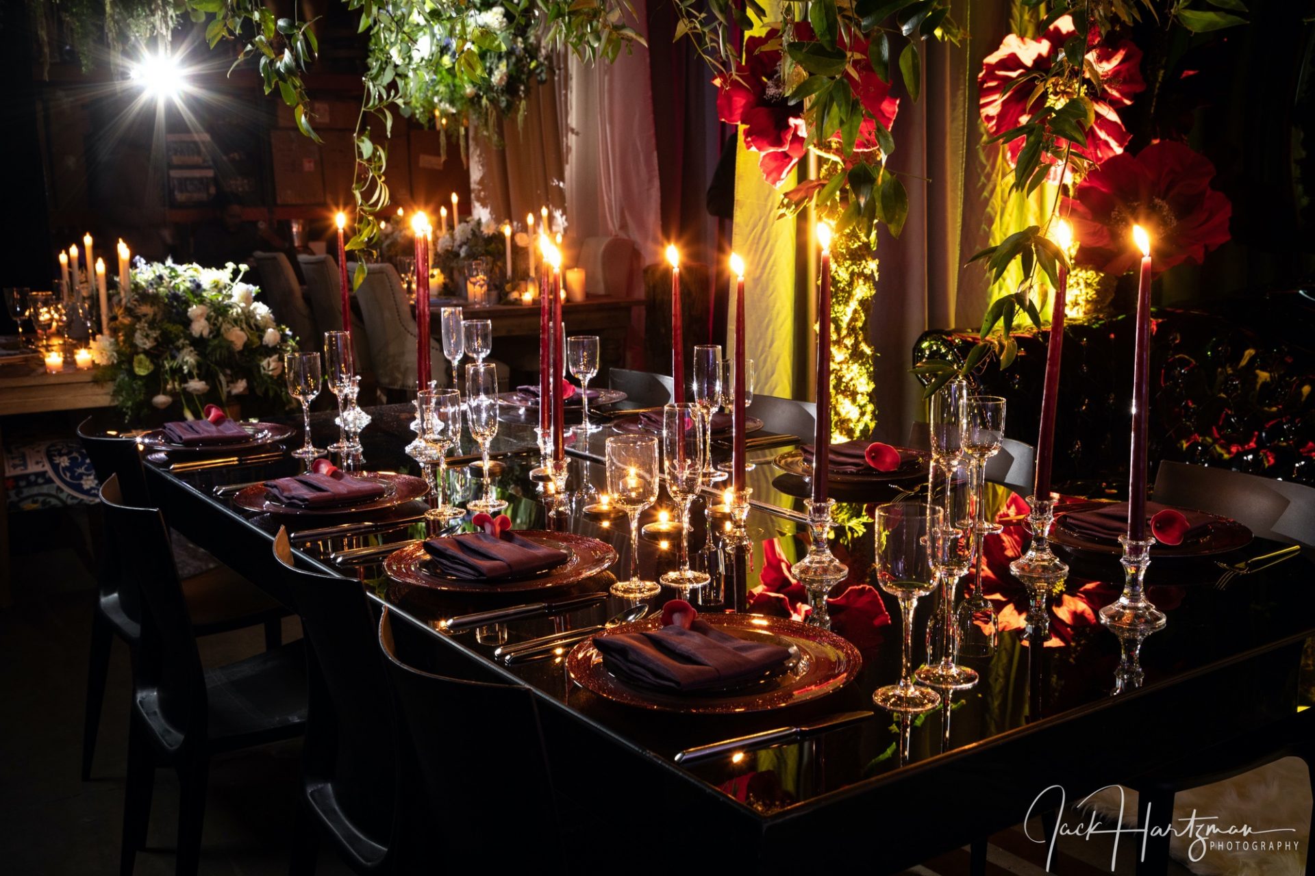 Delicate lighting instruments skillfully aimed at key parts of an event to highlight something. Table centerpieces, buffet, signage, event walkways. Can be mechanically or magnetically attached to ceilings, or mounted on pipe with bases around the event perimeter. Poles can be covered to match theme in most venues.